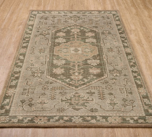 Vintage-Style Marietta Hand Knotted Wool Rug – Neutral Beige & Sage Green Medallion Design Inspired Carpet