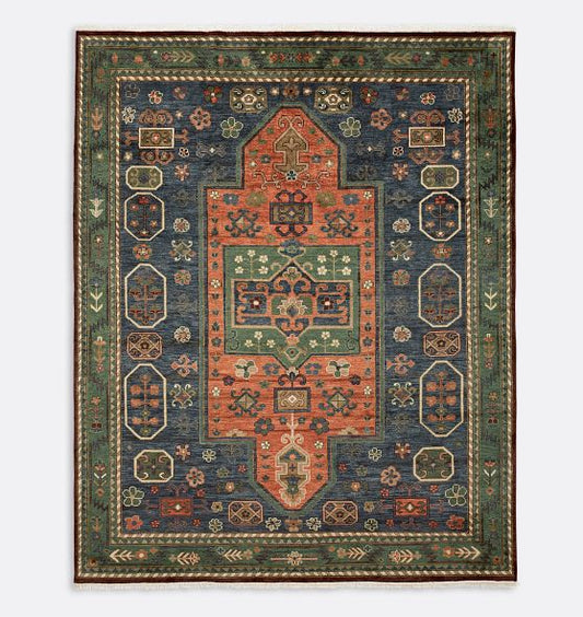 Hand-Knotted Tribal Wool Rug – Rust, Navy & Green Geometric Design, Traditional Kazak-Inspired Carpet