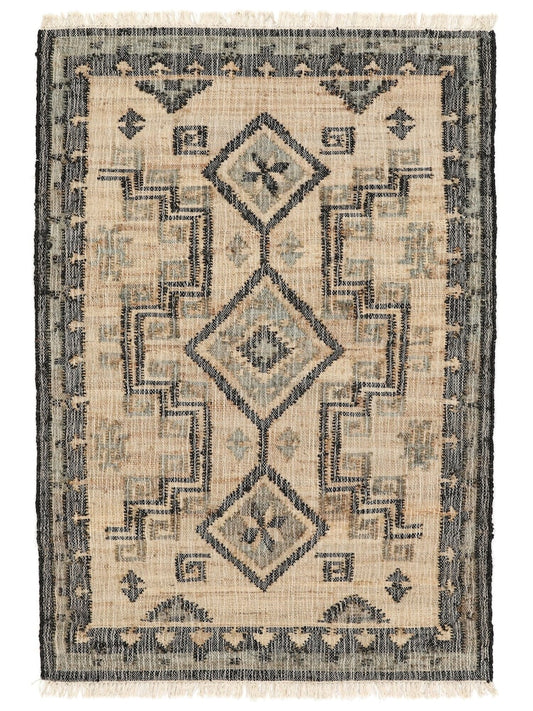 Handwoven Jute and Wool Flatweave Rug – Natural & Ivory with Tribal Geometric Pattern