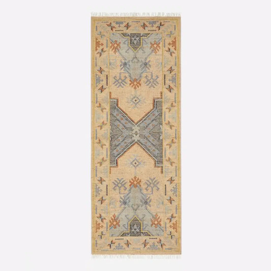 Blue & Beige Geometric Medallion Rug – Handwoven Wool-Jute Flatweave