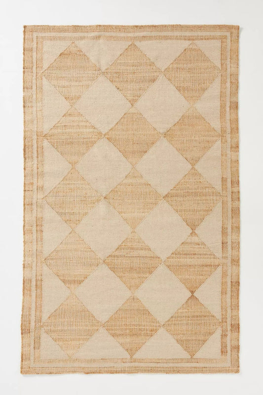 Description Handwoven Jute & Wool Flatweave Rug – Diamond Checkered Pattern in Natural & Beige...