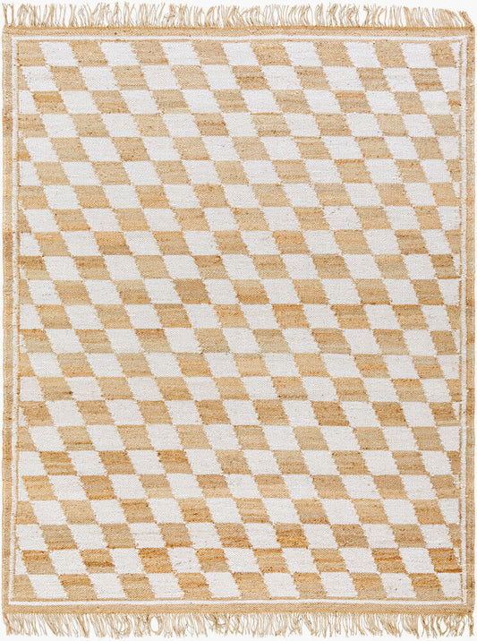 Handwoven Jute & Cotton Rug – Natural & White Diamond Checkered Pattern with Fringe