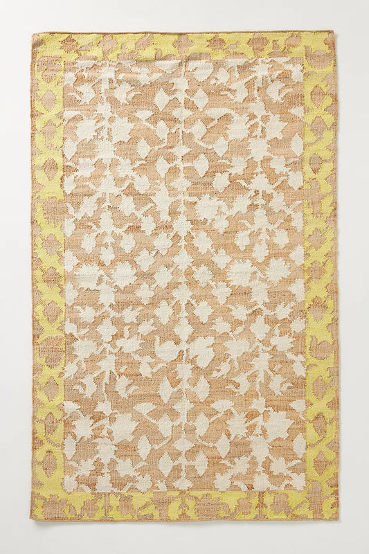 Handwoven Jute & Wool Rug with Floral Border Design - Natural, Yellow & Ivory