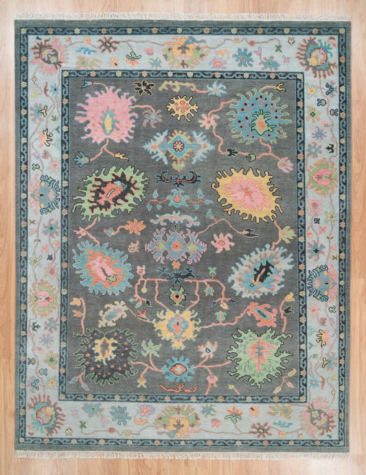 Midnight Garden | Handwoven Dark Grey & Blue Oushak Rug with Pink & Green Accents | Wool, Bedroom