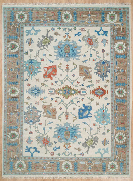 Enchanted Tapestry | Ivory Oushak Rug with Gray Border & Colorful Accents | Wool, Bedroom