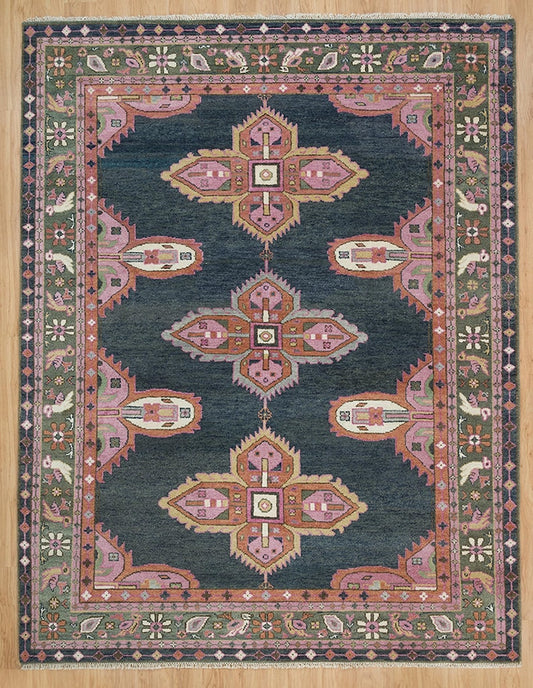 Emerald & Navy Tapestry | Handwoven Turkish Oushak Rug with Pink Accents | Wool