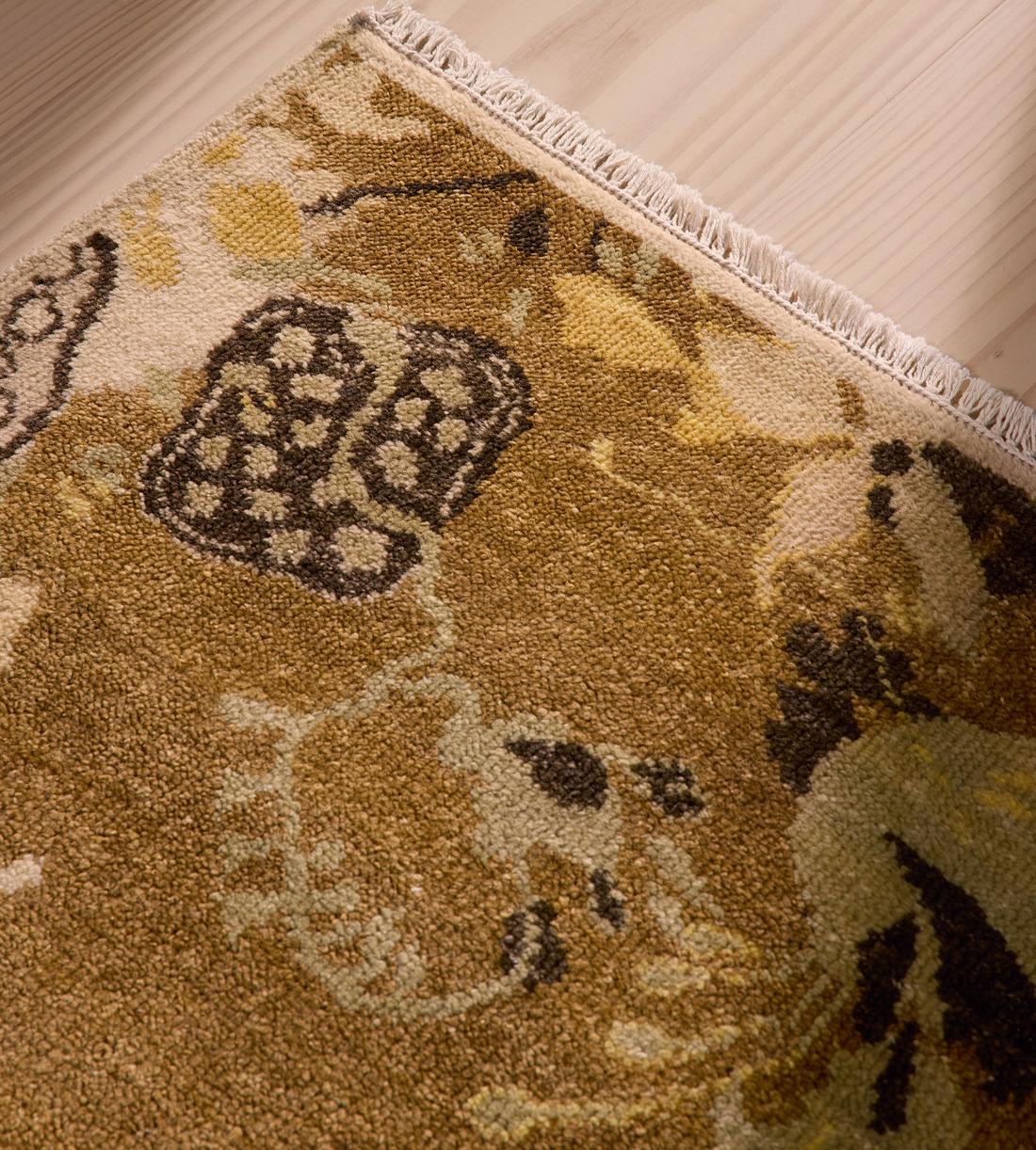 Hand-Knotted Abstract Botanical Oushak Wool Area Rug – Mustard Gold & Olive Green | Turkish-Inspired Boho Décor for Large Rooms