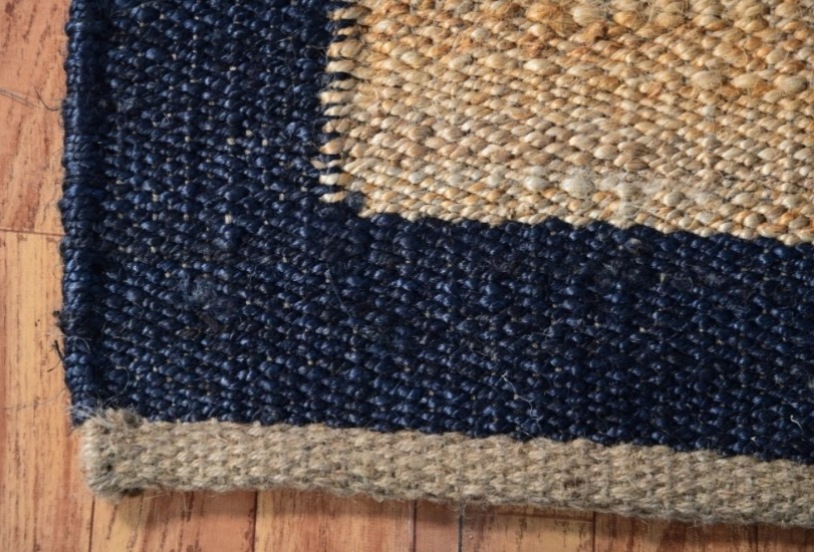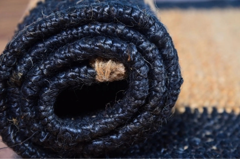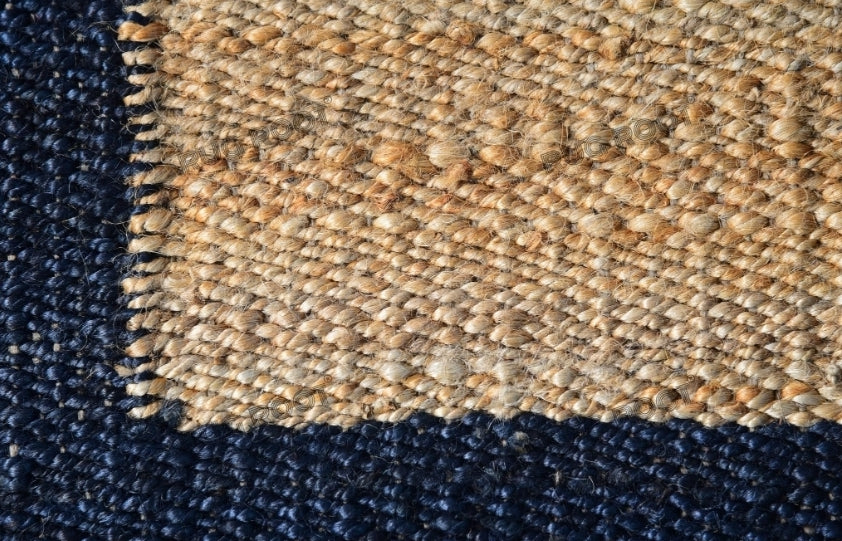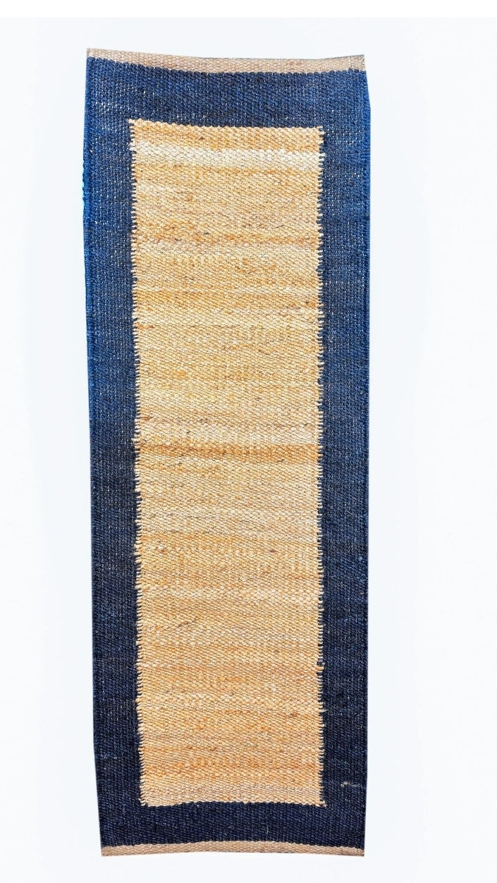Elevate narrow spaces with this elegant handwoven jute and wool runner rug, featuring a warm natural center beautifully framed by a bold navy blue border. Designed for hallways, entryways, or transitional areas, this runner blends rustic charm with modern sophistication.