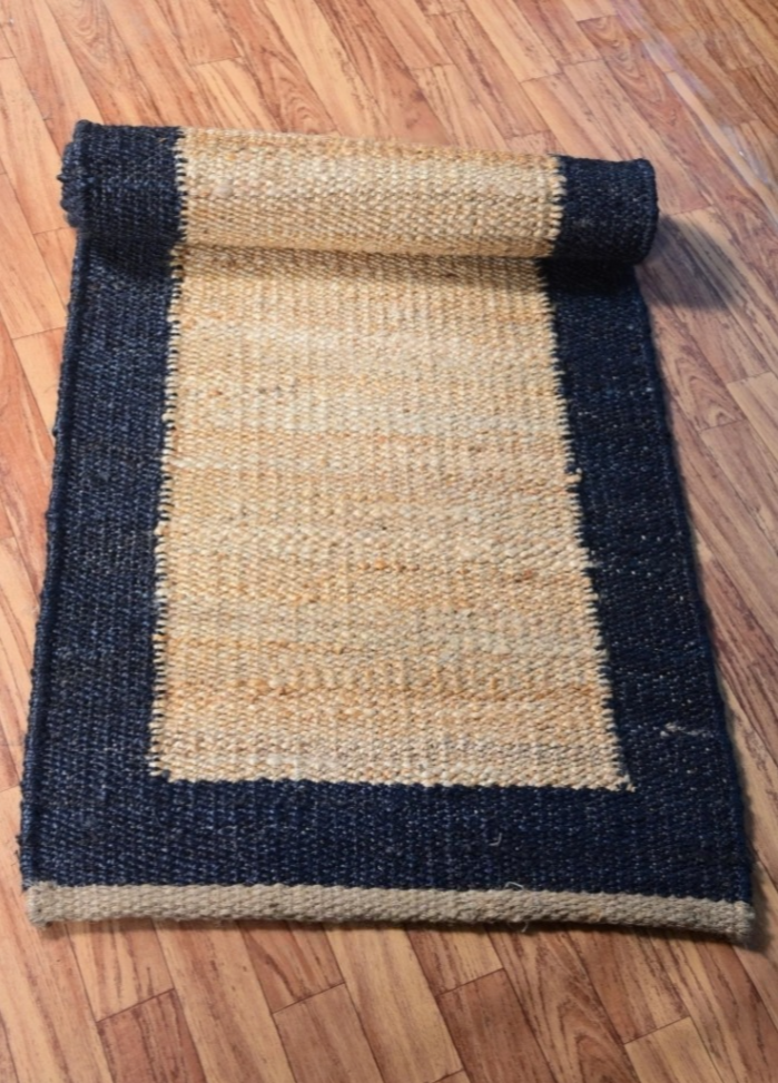Minimalist Handwoven Runner – Jute & Wool Blend with Clean Navy Border Accent