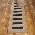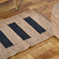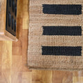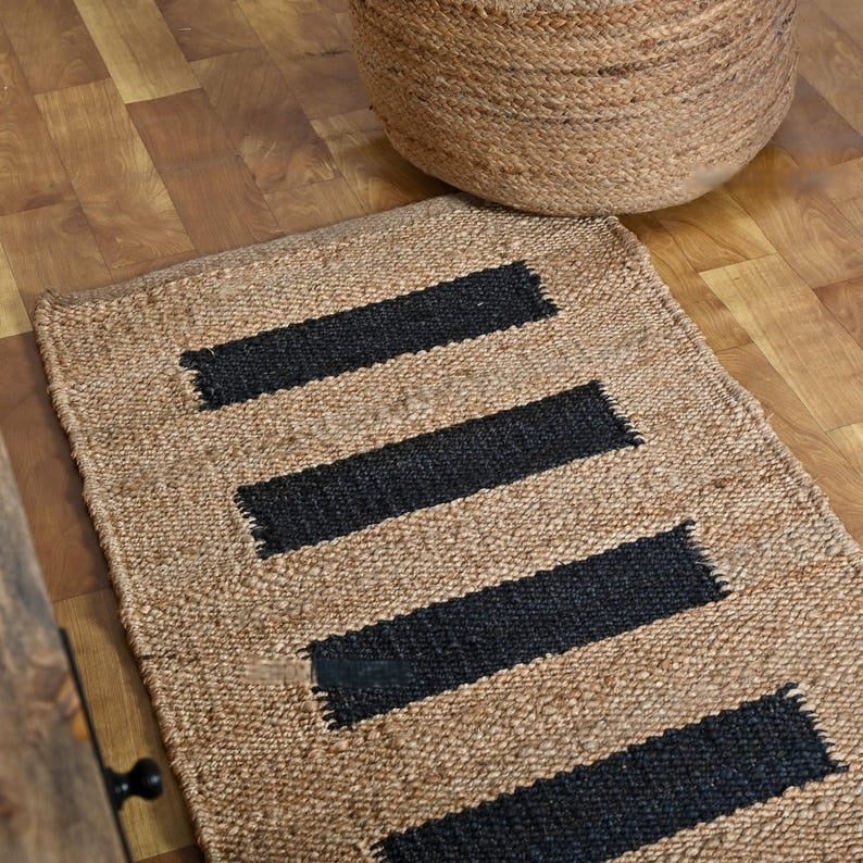 Elevate your interiors with this handwoven jute and wool runner rug, featuring a sleek black stripe pattern set against a natural jute background. Expertly crafted by artisans, this runner blends organic texture with modern design, making it a perfect fit for hallways, entryways, kitchens, or narrow living spaces.