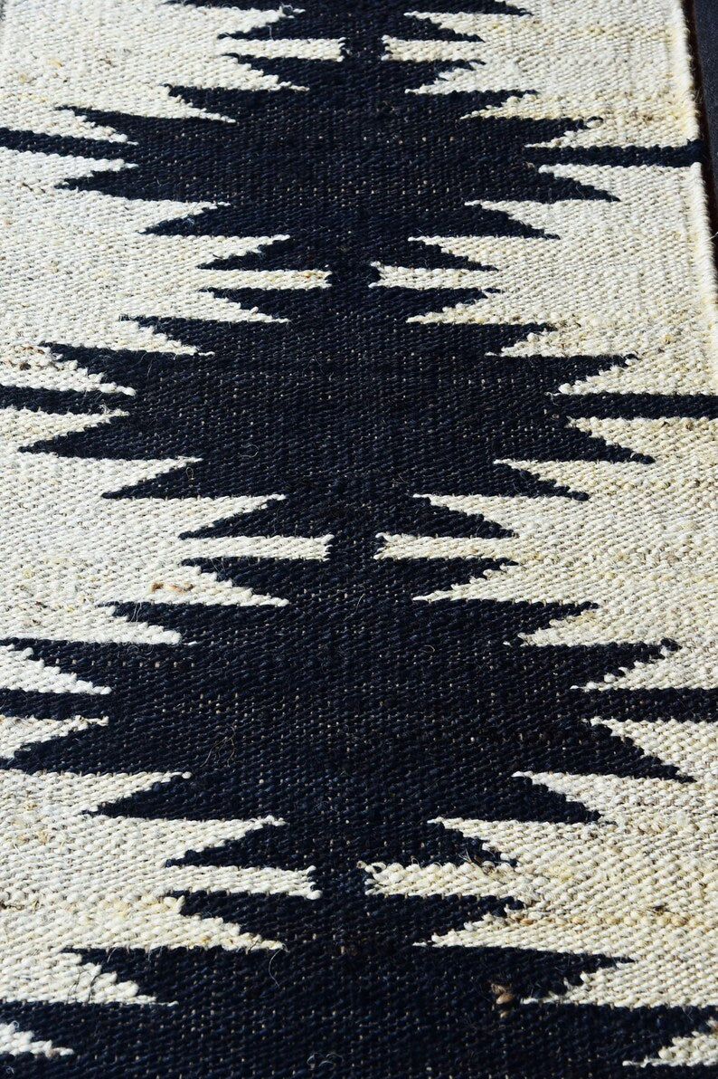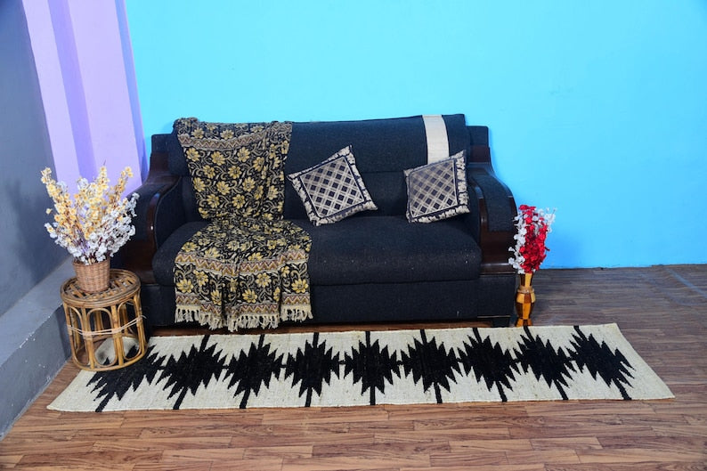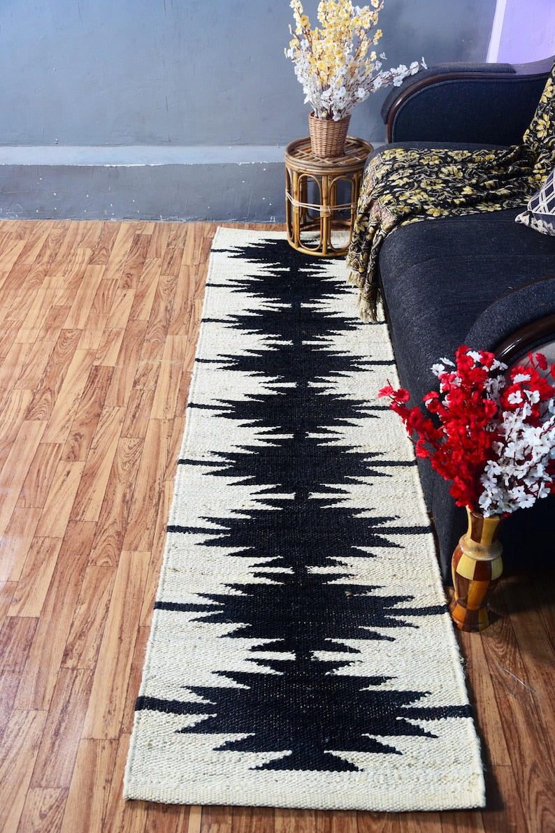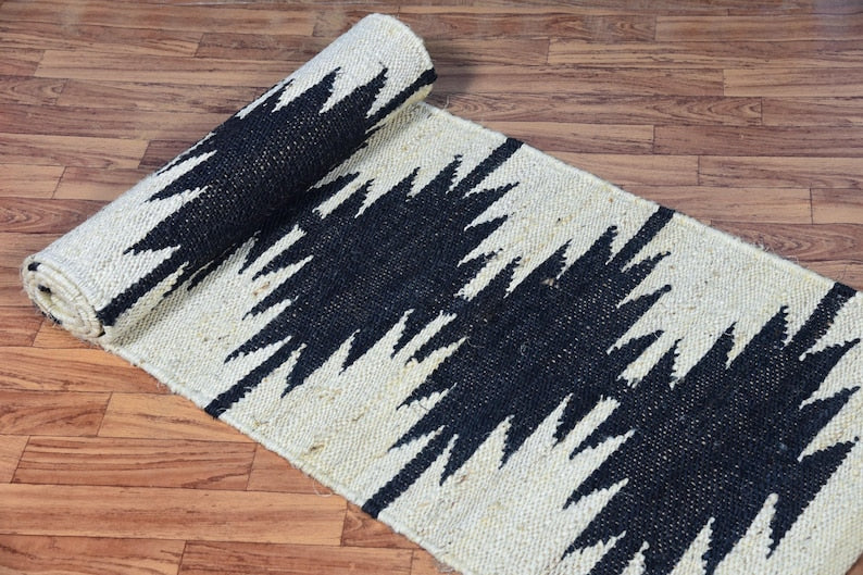 Handwoven Jute Runner Rug with Black Zigzag Tribal Pattern - Natural & Black