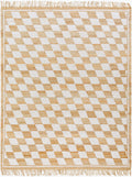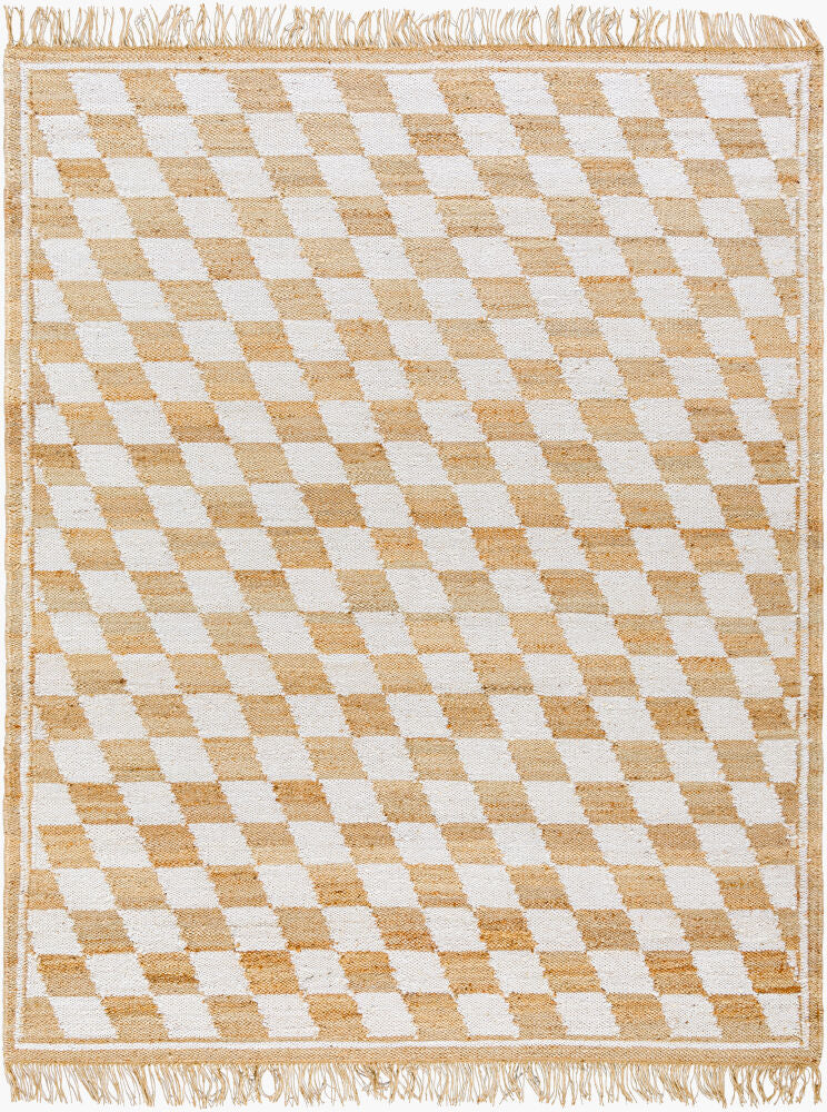 Add texture and style to your living space with this handwoven jute and cotton rug, featuring a natural and white diamond checkered pattern. The size makes it ideal for living rooms, dining rooms, or bedrooms. Its fringed edges add a touch of artisanal charm, while the natural jute provides durability and the cotton ensures softness underfoot. Perfect for a variety of interior styles, this rug brings a balanced mix of rustic and modern appeal to any room.