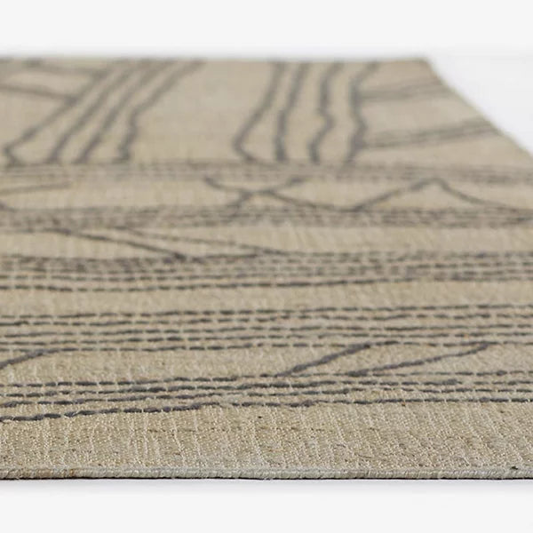 This handwoven wool & jute rug features an eye-catching abstract linear pattern in natural and black tones. Its flatweave design adds texture and warmth to your space, making it a perfect addition for living rooms, bedrooms, or hallways. Crafted with a blend of durable jute and soft wool, this rug brings a modern aesthetic while maintaining a natural, earthy vibe. The intricate black lines contrast beautifully against the natural base, creating a piece that is both contemporary and timeless.