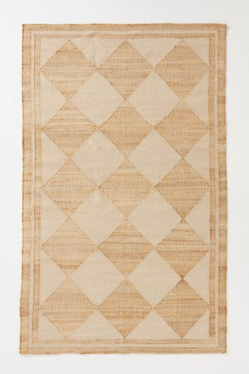 Handwoven Jute & Wool Flatweave Rug – Diamond Checkered Pattern in Natural & Beige