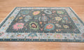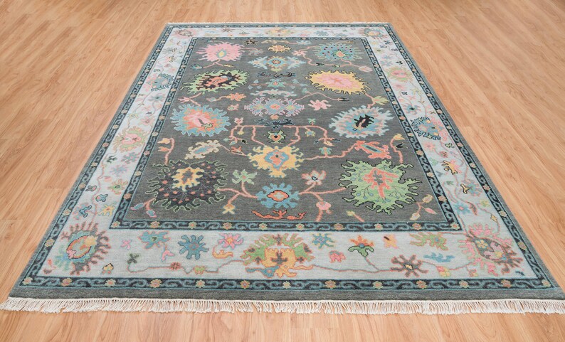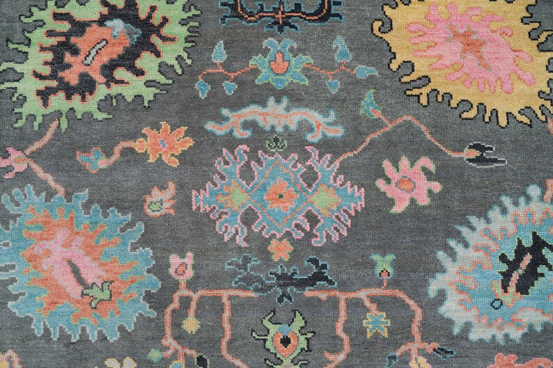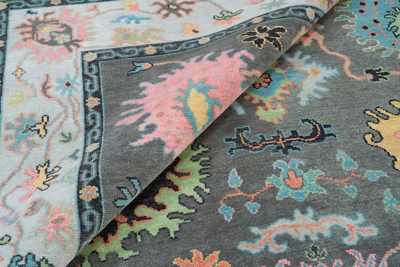 Handwoven Midnight Garden Wool Rug – Dark Grey & Blue Oushak with Subtle Pink & Green Details, Timeless Elegance