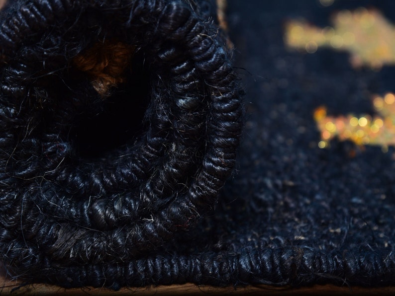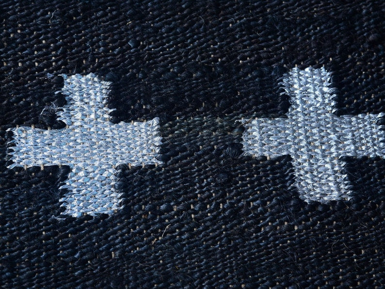 This unique handwoven jute and wool runner rug features a striking black background adorned with gold and white cross patterns. The size makes it perfect for hallways, entryways, or narrow spaces, adding a modern touch with its bold design. Made from a durable jute and wool blend, this rug is designed to withstand high-traffic areas while maintaining comfort underfoot. Its vibrant color contrasts bring a dynamic visual element, making it a great choice for contemporary interiors.