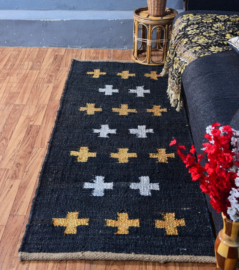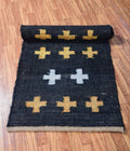Handwoven Jute & Wool Runner Rug – Black with Gold & White Cross Pattern