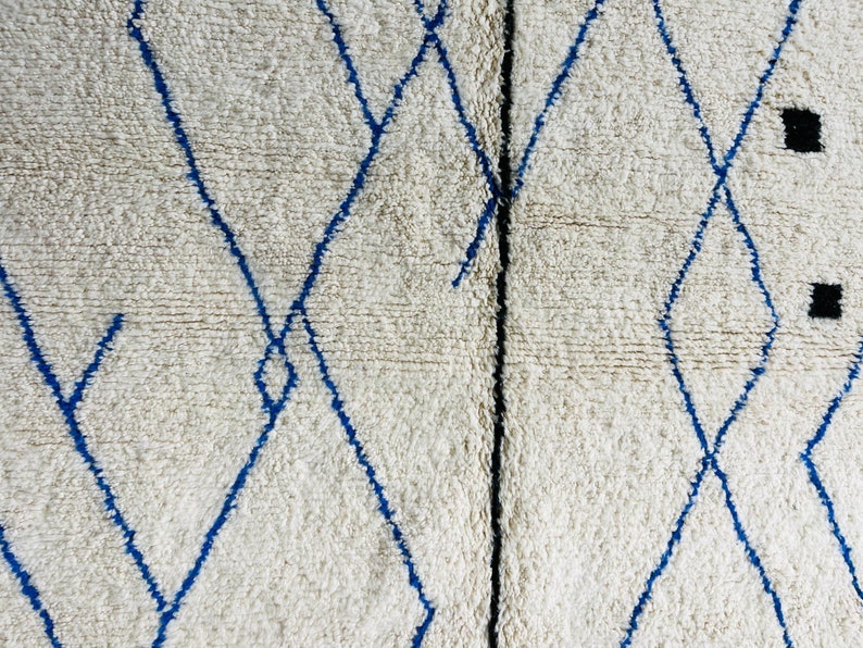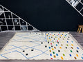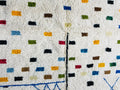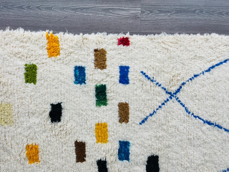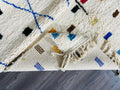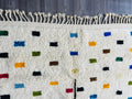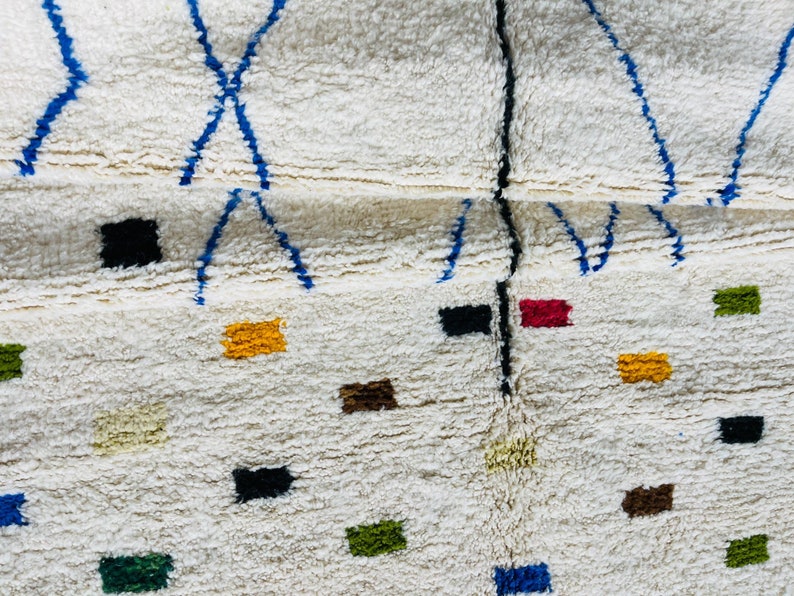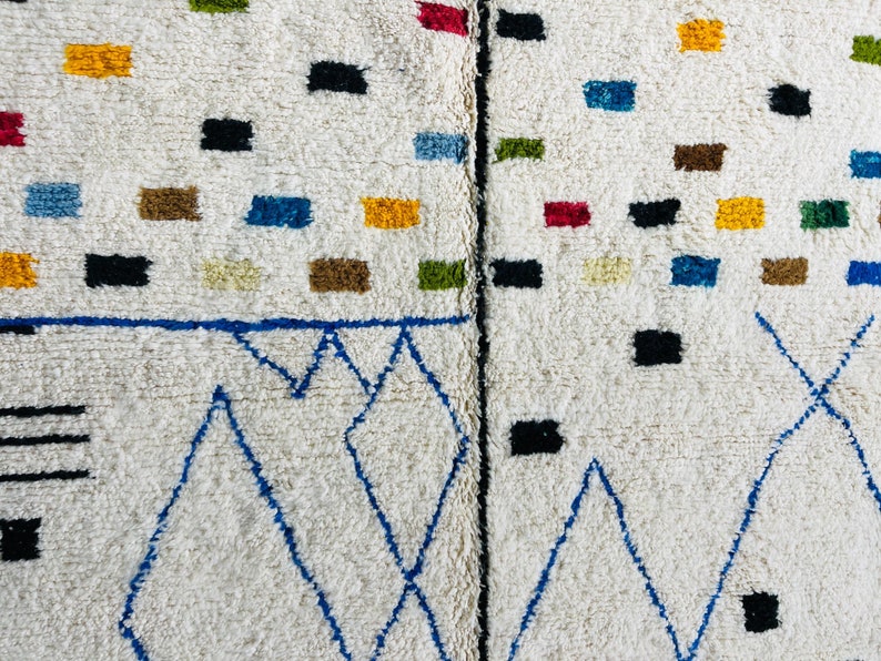 Elevate your space with the contemporary energy of Morocco with this handwoven Azilal rug. Crafted by skilled artisans in the Atlas Mountains, this unique piece features a striking geometric design of bold blue diamonds against a pristine white wool background. The minimalist aesthetic is punctuated by playful color accents, adding a touch of whimsy and personality. This rug is more than just floor covering; it's a work of art and a conversation starter. It complements a variety of interior styles, from modern to eclectic. Whether draped over a sofa, placed under a dining table, or hung on a wall as a tapestry, this Azilal rug will infuse your space with warmth, character, and a touch of Moroccan magic.