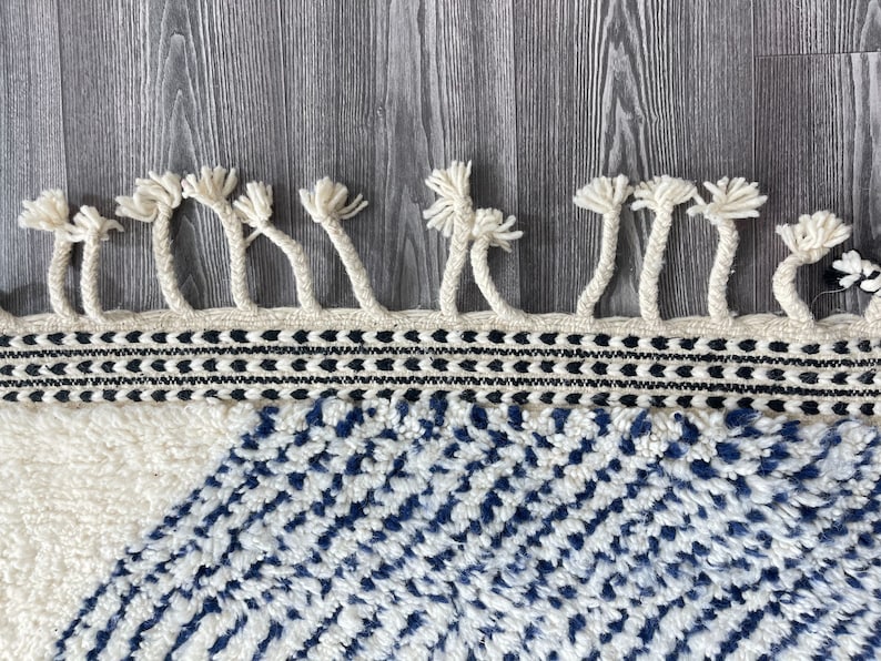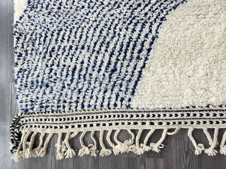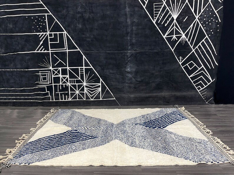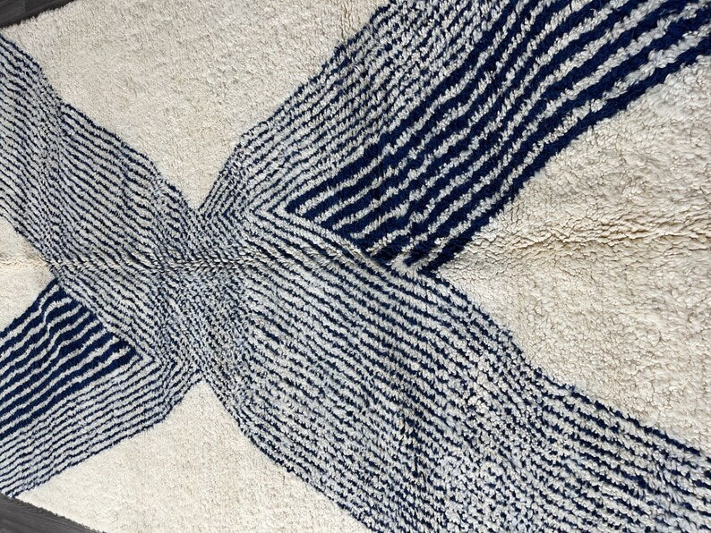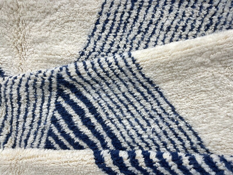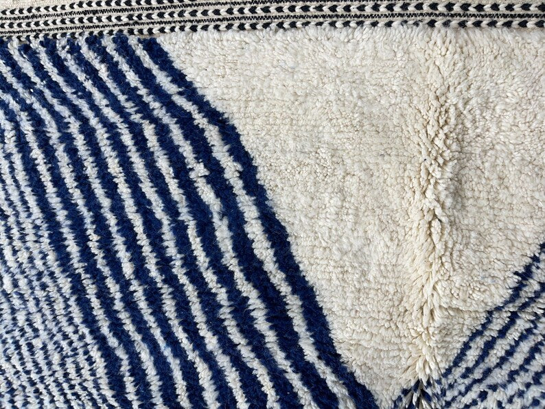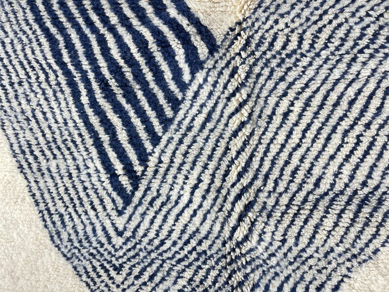 Embrace the serene beauty of Moroccan artistry with this handwoven Beni Ourain rug, crafted by skilled Berber artisans. Designed with soft ivory wool and subtle indigo accents, its geometric patterns draw inspiration from traditional Moroccan motifs while maintaining a clean, modern aesthetic. Plush, durable, and timeless, this rug is more than just décor—it’s a cultural masterpiece that brings warmth, comfort, and elegance to your home. Perfect for bedrooms, living rooms, or modern retreats, it creates a cozy yet sophisticated atmosphere in any space.
