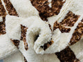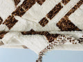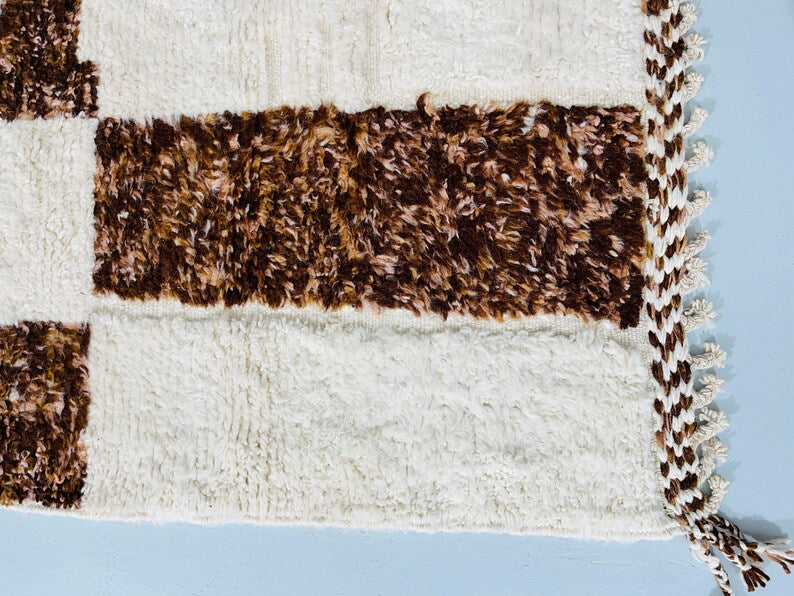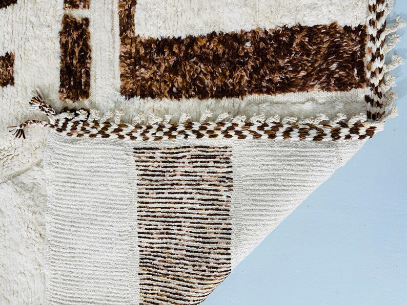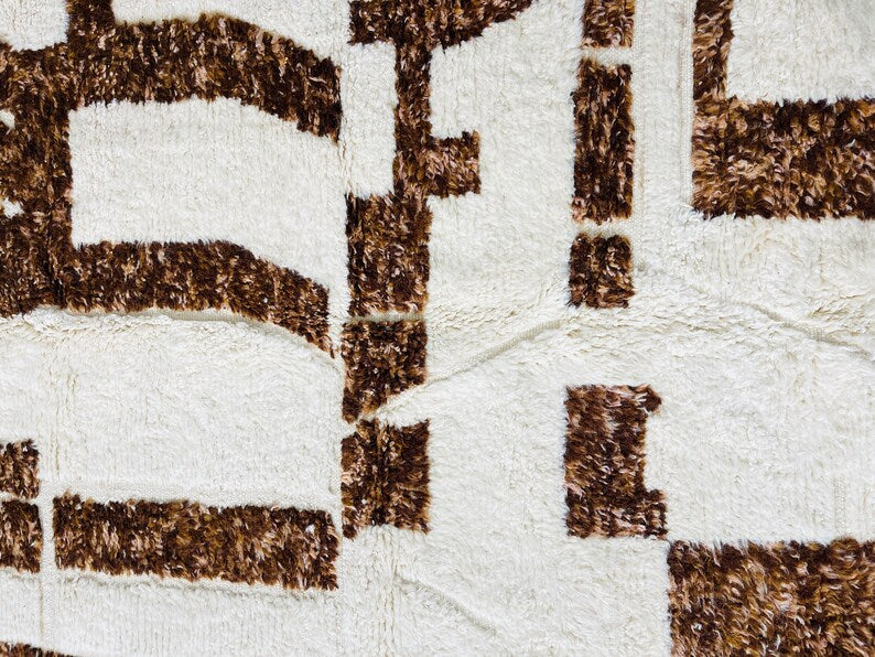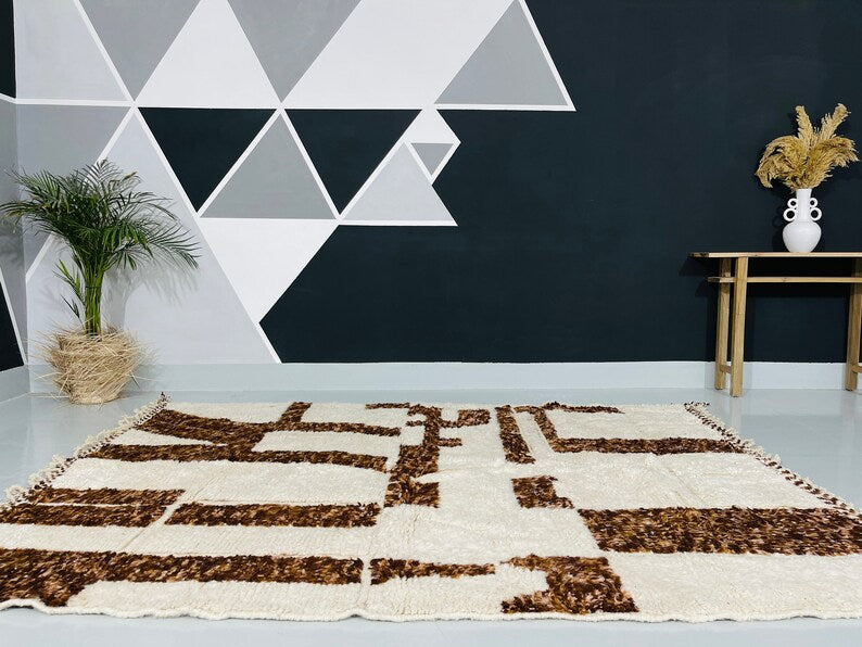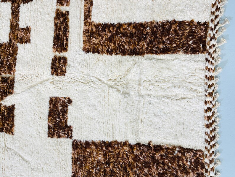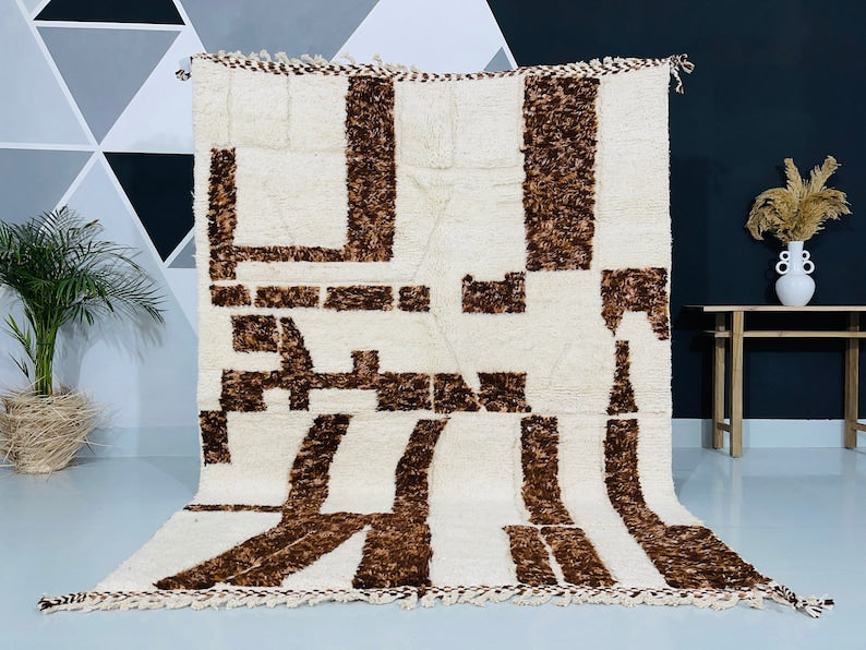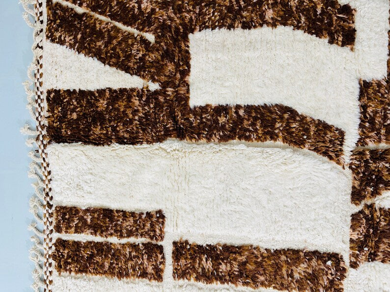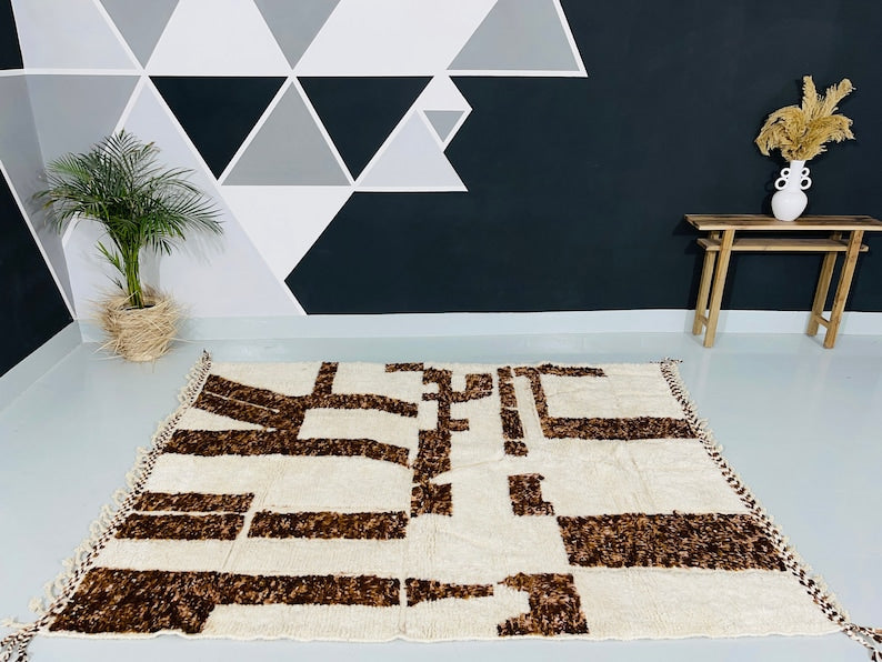 Embrace Moroccan craftsmanship with this authentic handwoven tribal rug, crafted from soft natural wool in earthy brown tones and creamy white accents. Showcasing a striking mix of geometric patterns and abstract Berber-inspired motifs, this rug is both timeless and versatile. Its neutral palette makes it perfect for bedrooms, living rooms, or entryways—adding warmth, cultural richness, and bohemian elegance to any space.